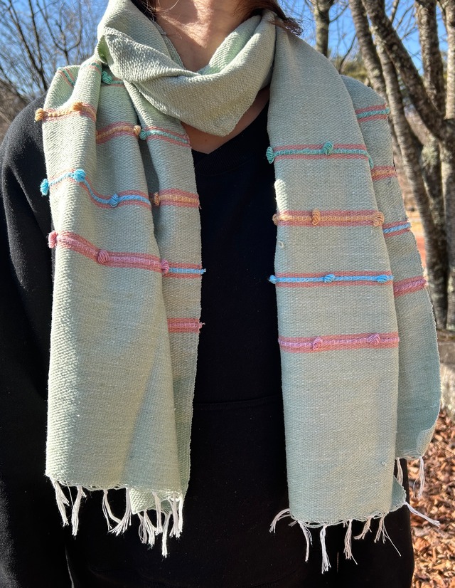 Sabaideaoにお越しいただきありがとうございます! ラオスの世界遺産の町、ルアンパバーンに住むモン族の女性達が、ラオコットンを使い、手織りで織り、天然染料で染めて作られたストールです。 小さいボンボンがあしらわれており、グリーンを基調としてデザインされたストールは、生地も柔らかい上に軽く、首にも負担がかからないので、とても使いやすいです。 首元に使うものとして、ちょうどいい厚みです。 一年を通して使える期間も長いので、一枚あると便利です。 手仕事で1から作り上げられた物の良さを分かっていただき、大切にして頂けたら、作り手も売り手も嬉しいです。 サイズ:縦176cm 横39cm(概ね)(フリンジ含む) 《モン族》 モン族の人々は中国から移住し、ラオス北部の1000メートル以上の山岳地帯に村を作り、生活をしています。 ベトナム戦争でアメリカ側についた為、ベトナム戦争後、多くの人は難民になり、アメリカをはじめとして世界各国に離散していきました。 モン族の人達は文字を持たない代わりに、物語や歴史、暮らしなどを織物に記録し、文化や歴史を残したとも言われています。 また、モン族の布の生地は、昔は大麻生地が多かったそうですが、現在は綿布が多く、藍で染めたり蝋で模様を描いたりしています。 ※ 全て手作業の為、一つ一つの作品にばらつきや多少のほつれなどがある場合がございます。 ※手洗いされることをお勧めします。 ご理解の上、ご購入をお願い致します。 機械ではなく、人の手で作り上げた物をこの機会に是非。 遠いラオスの村から届いた手仕事に、出会って頂きありがとうございます。