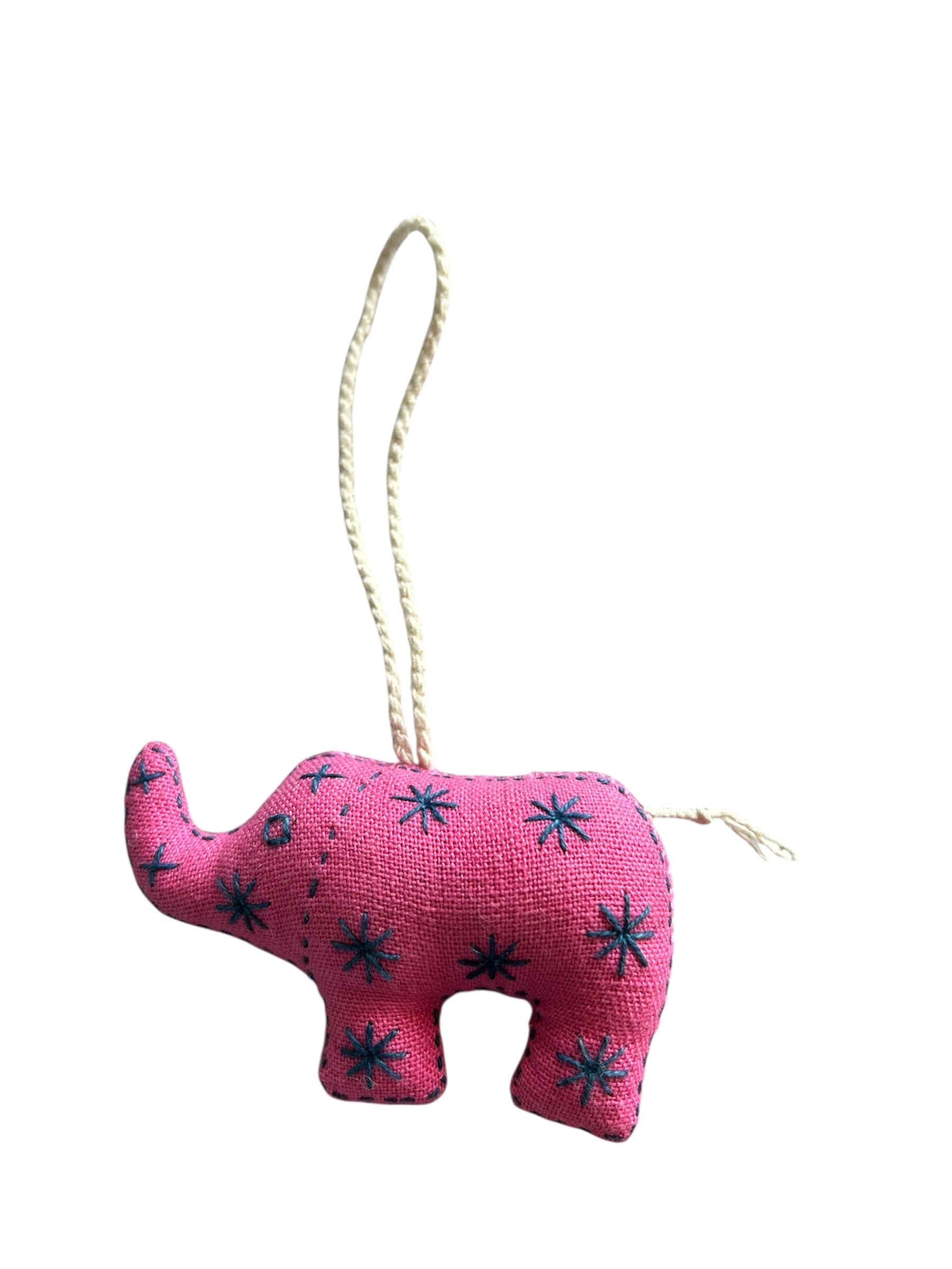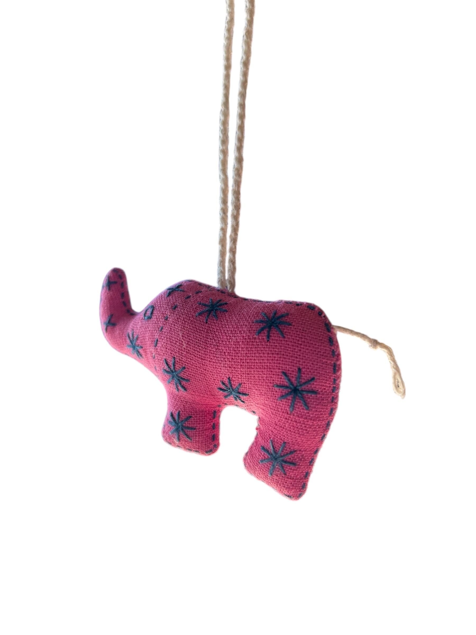 ピンクをベースに青で模様が刺繍されている可愛らしい象のチャームです。