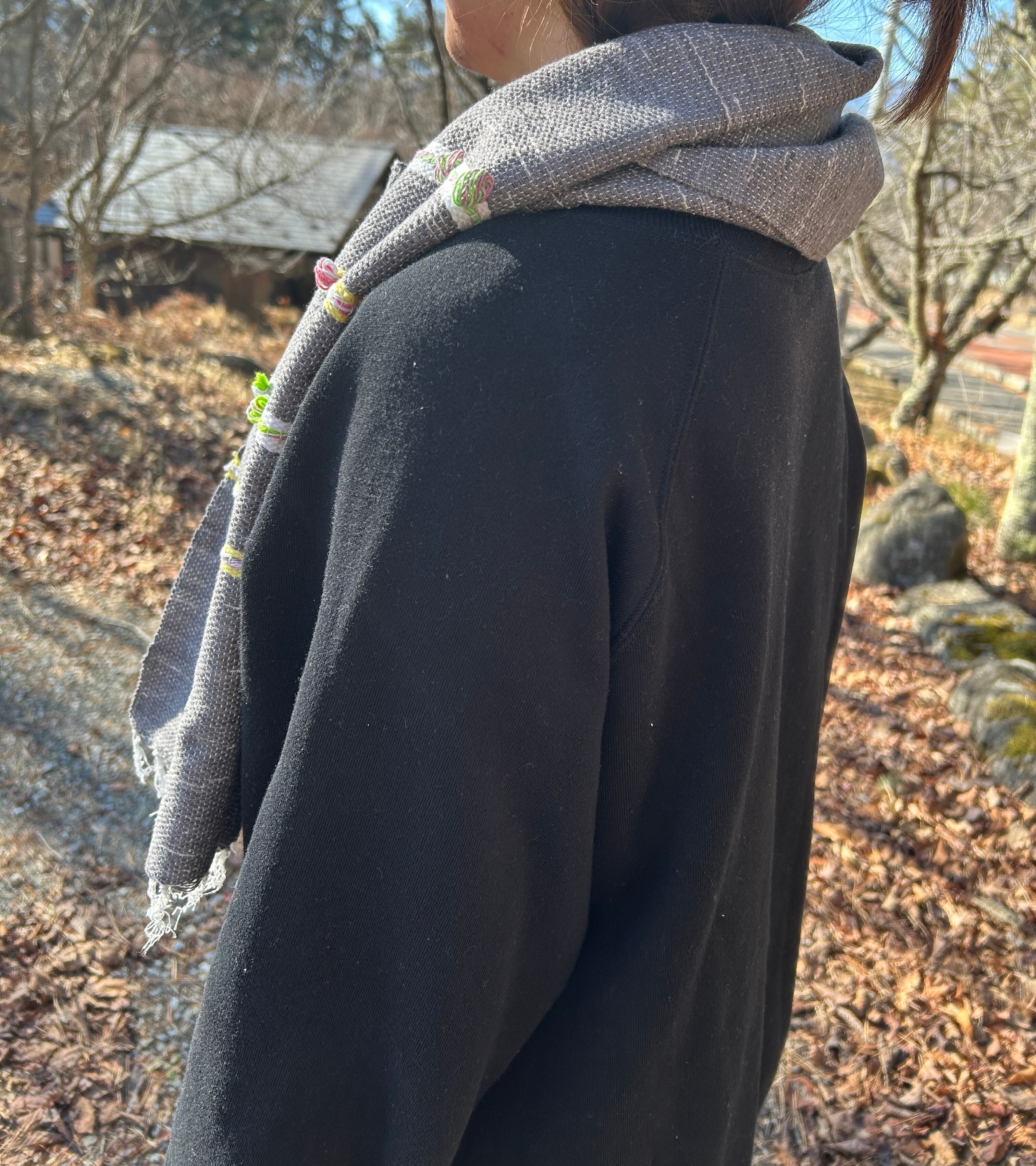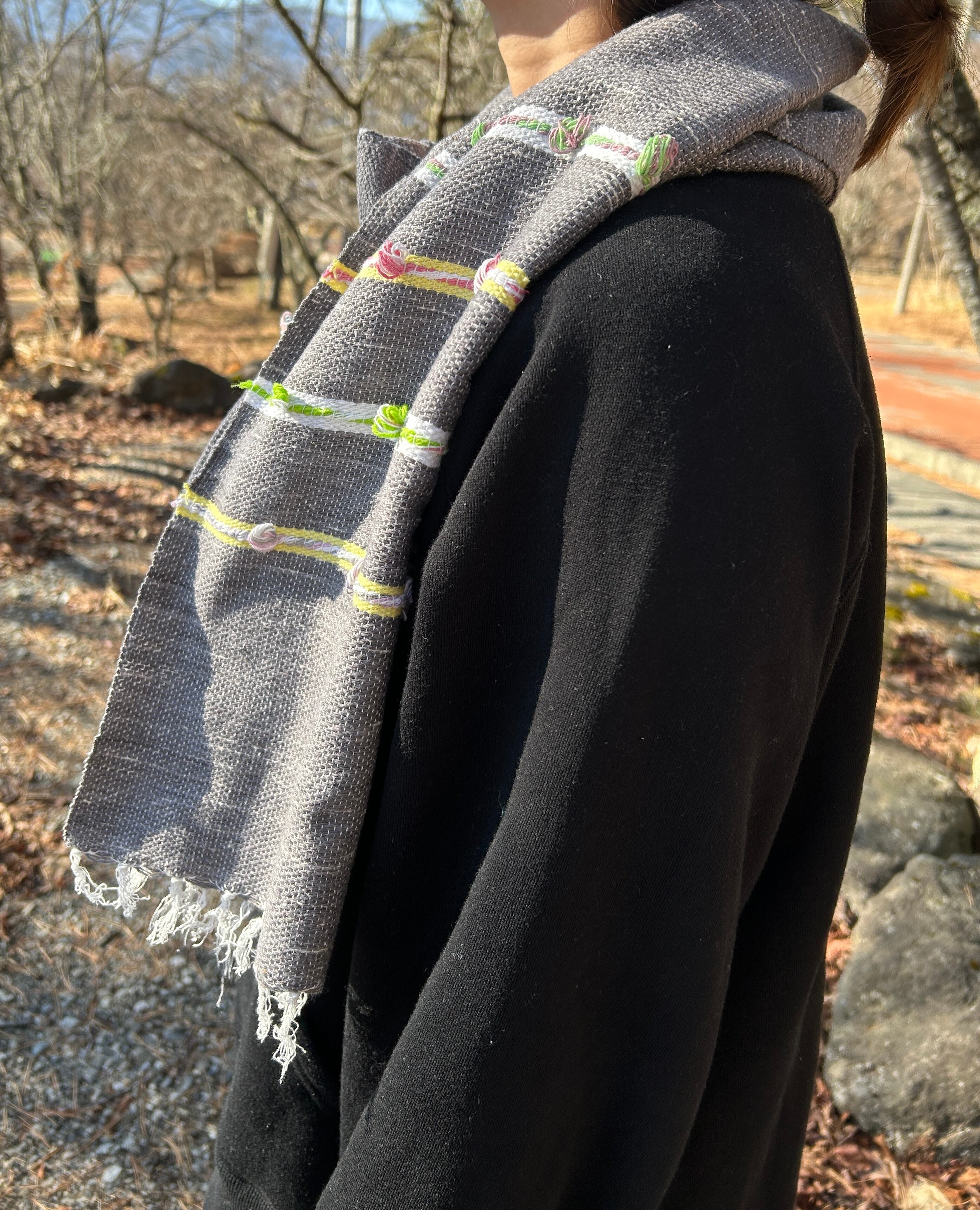 小さいボンボンがあしらわれており、グレーを基調としてデザインされたストールは、生地も柔らかい上に軽く、首にも負担がかからないので、とても使いやすいです。