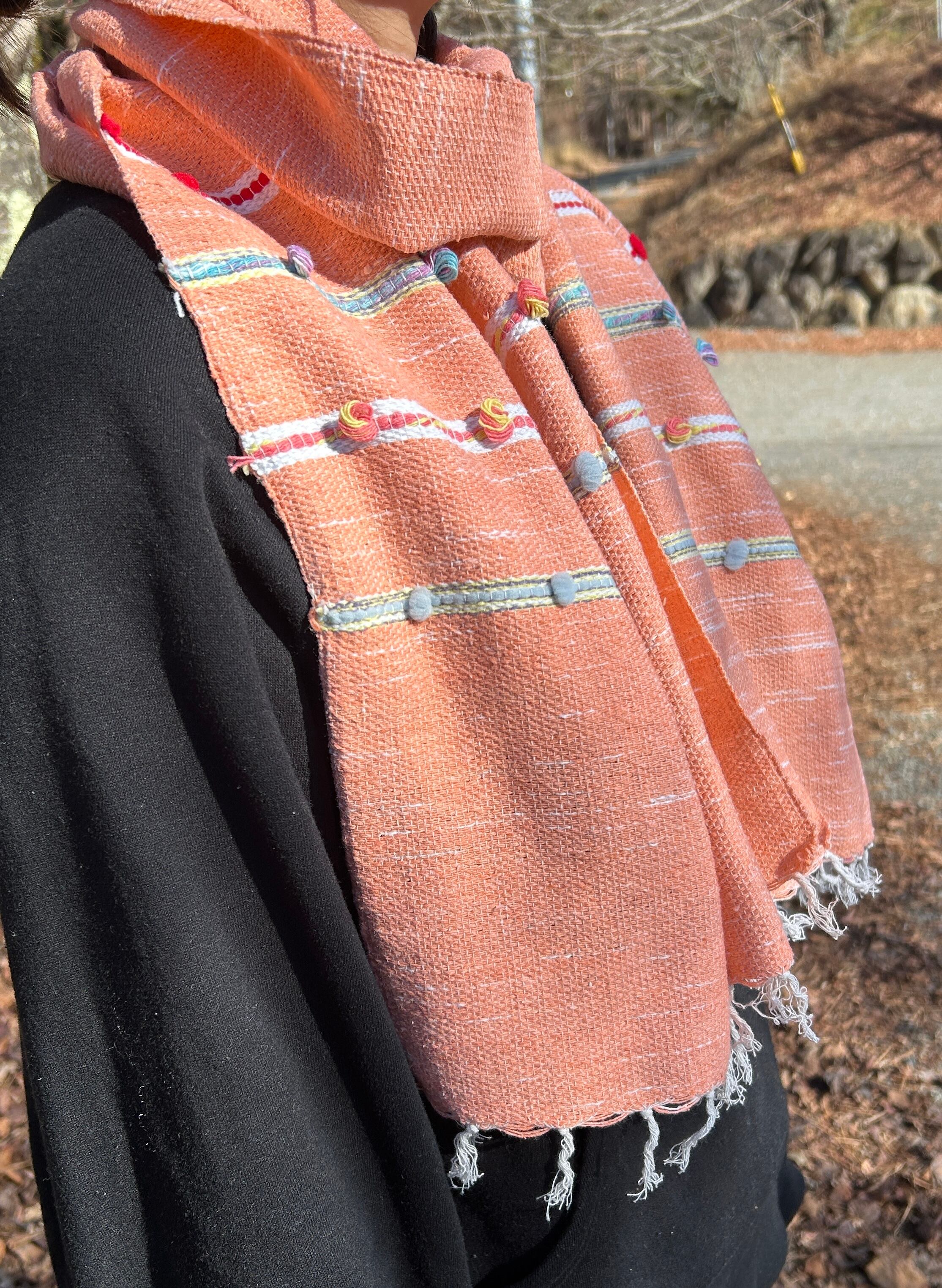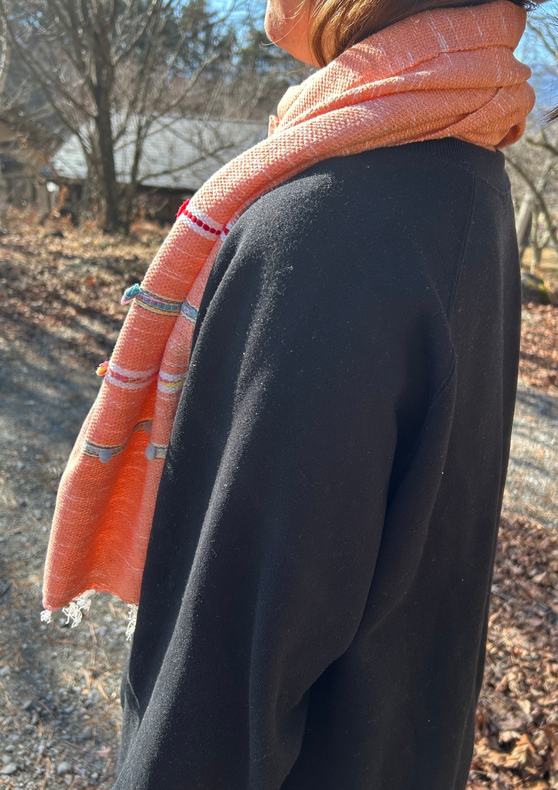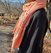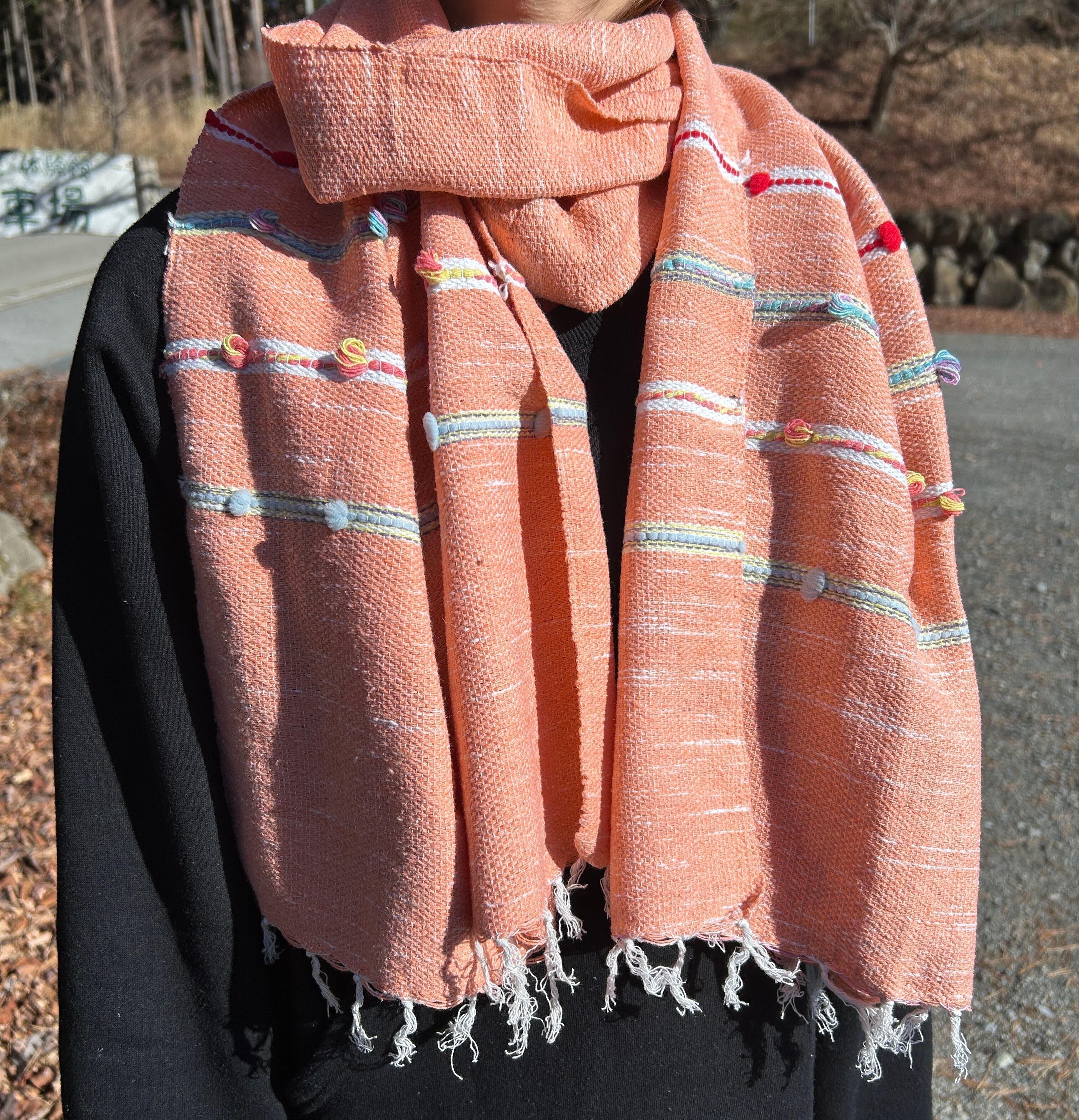 小さいボンボンがあしらわれており、サーモンピンクを基調としてデザインされたストールは、生地も柔らかい上に軽く、首にも負担がかからないので、とても使いやすいです。