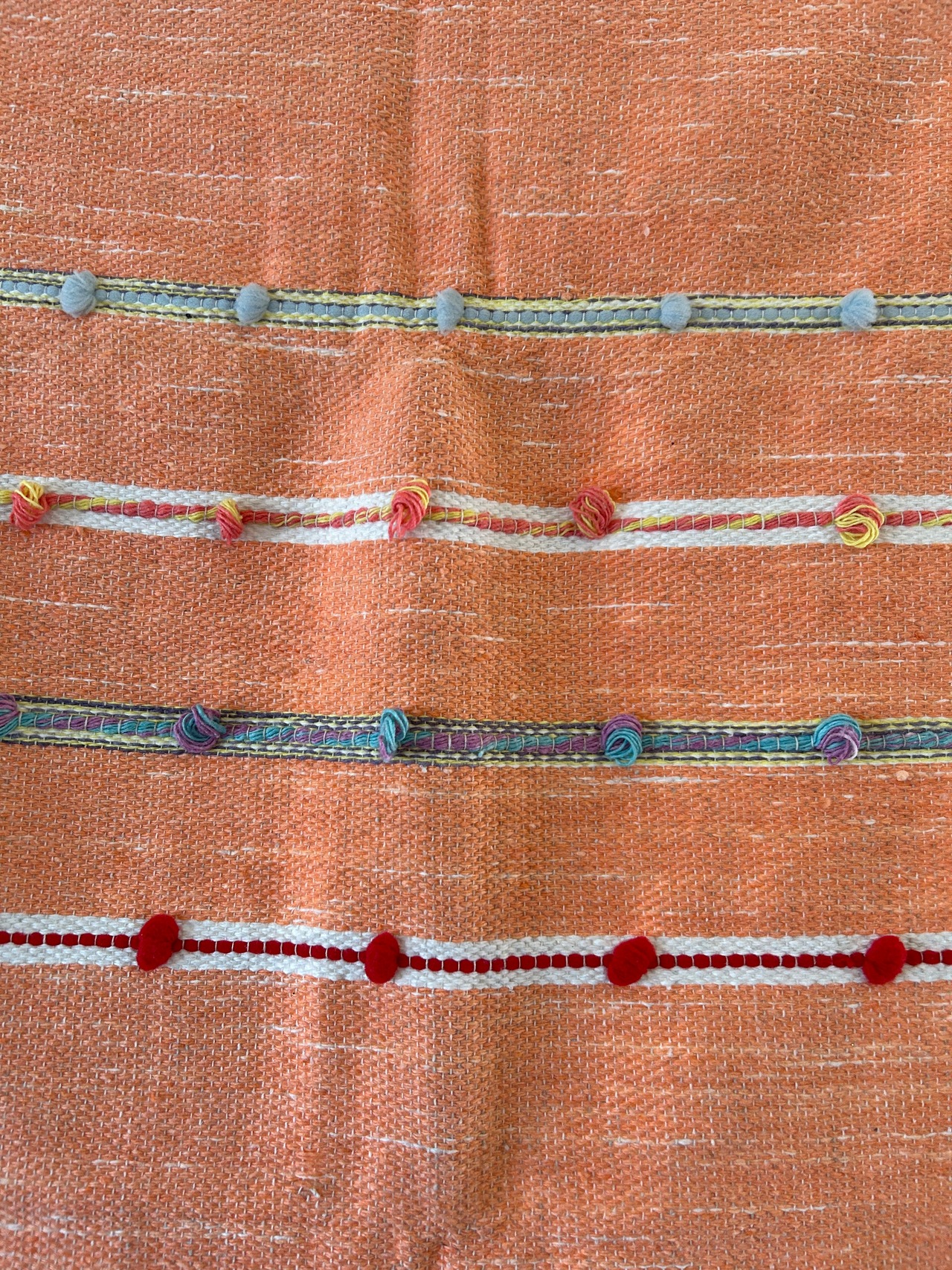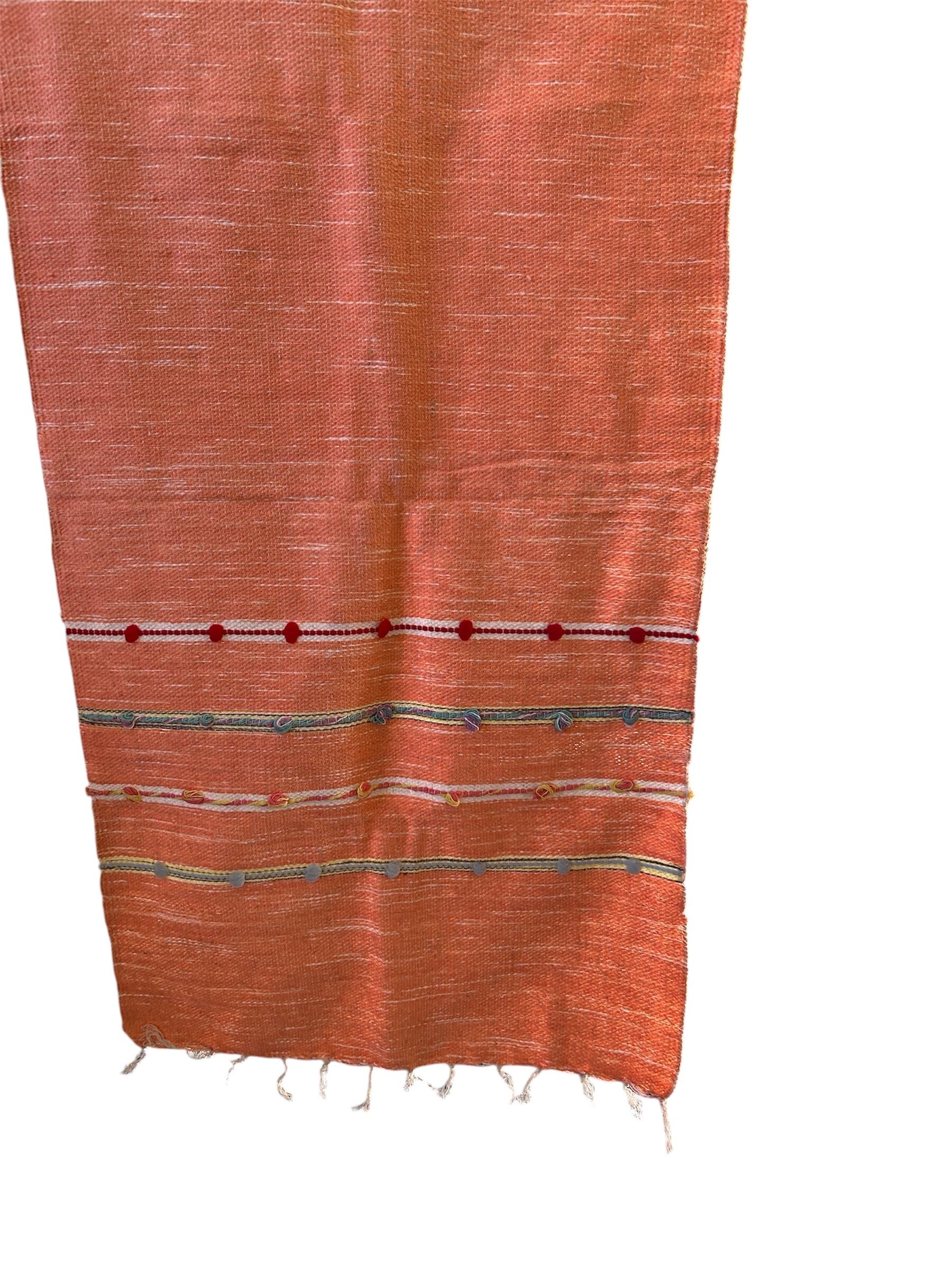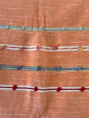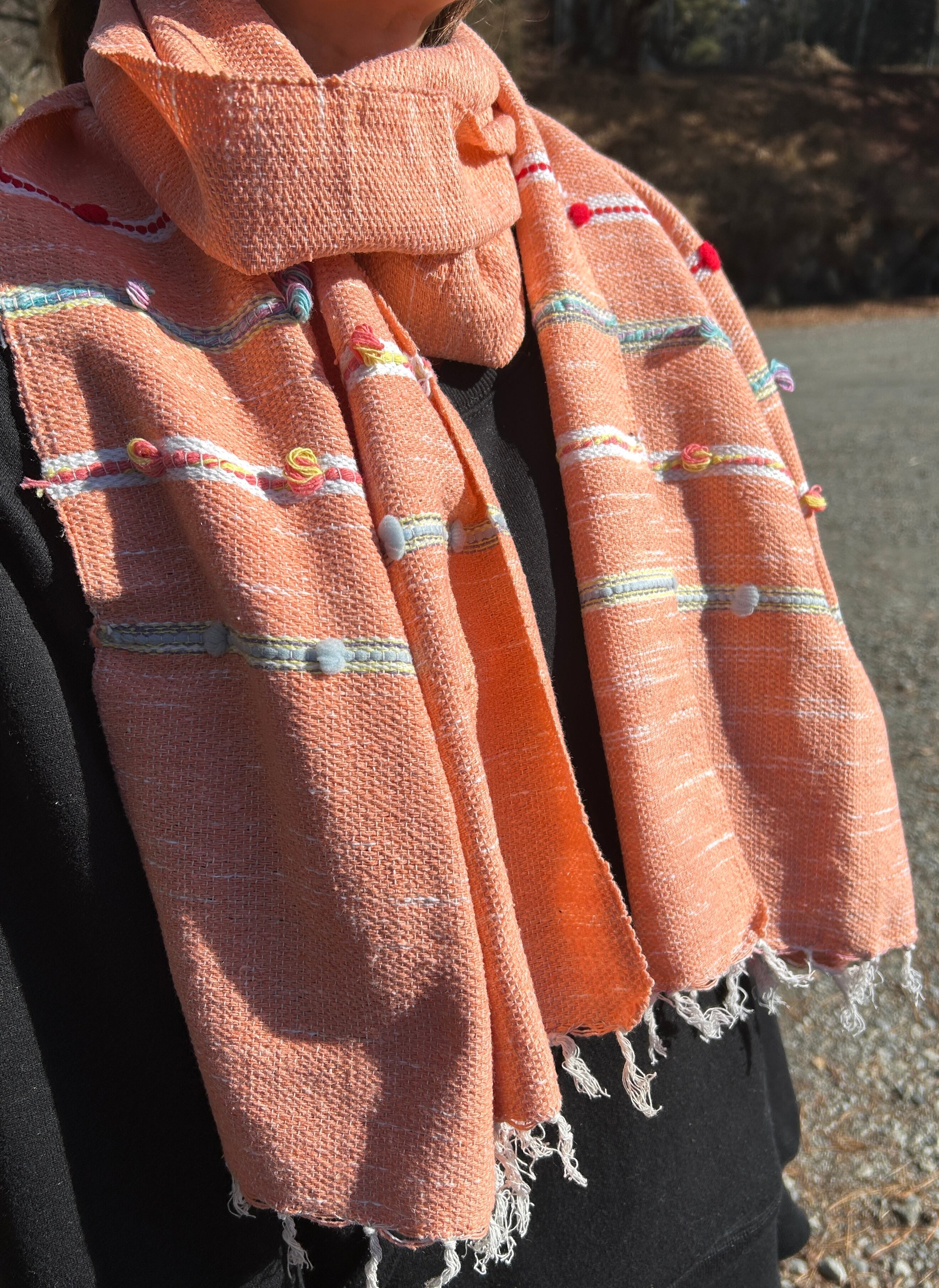 小さいボンボンがあしらわれており、サーモンピンクを基調としてデザインされたストールは、生地も柔らかい上に軽く、首にも負担がかからないので、とても使いやすいです。