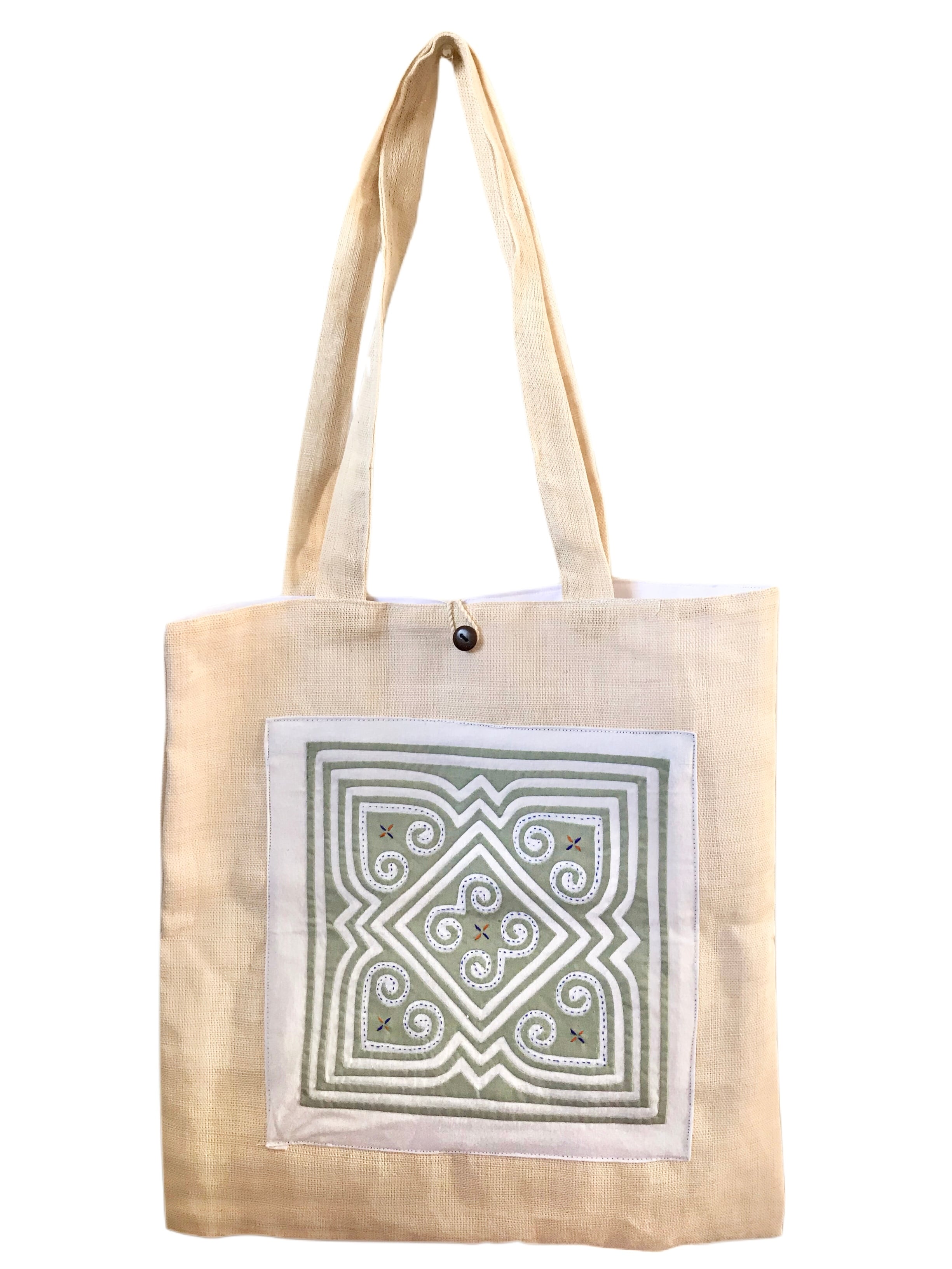 バッグには、モン族の刺繍が施されており、手織りした布で作られています。