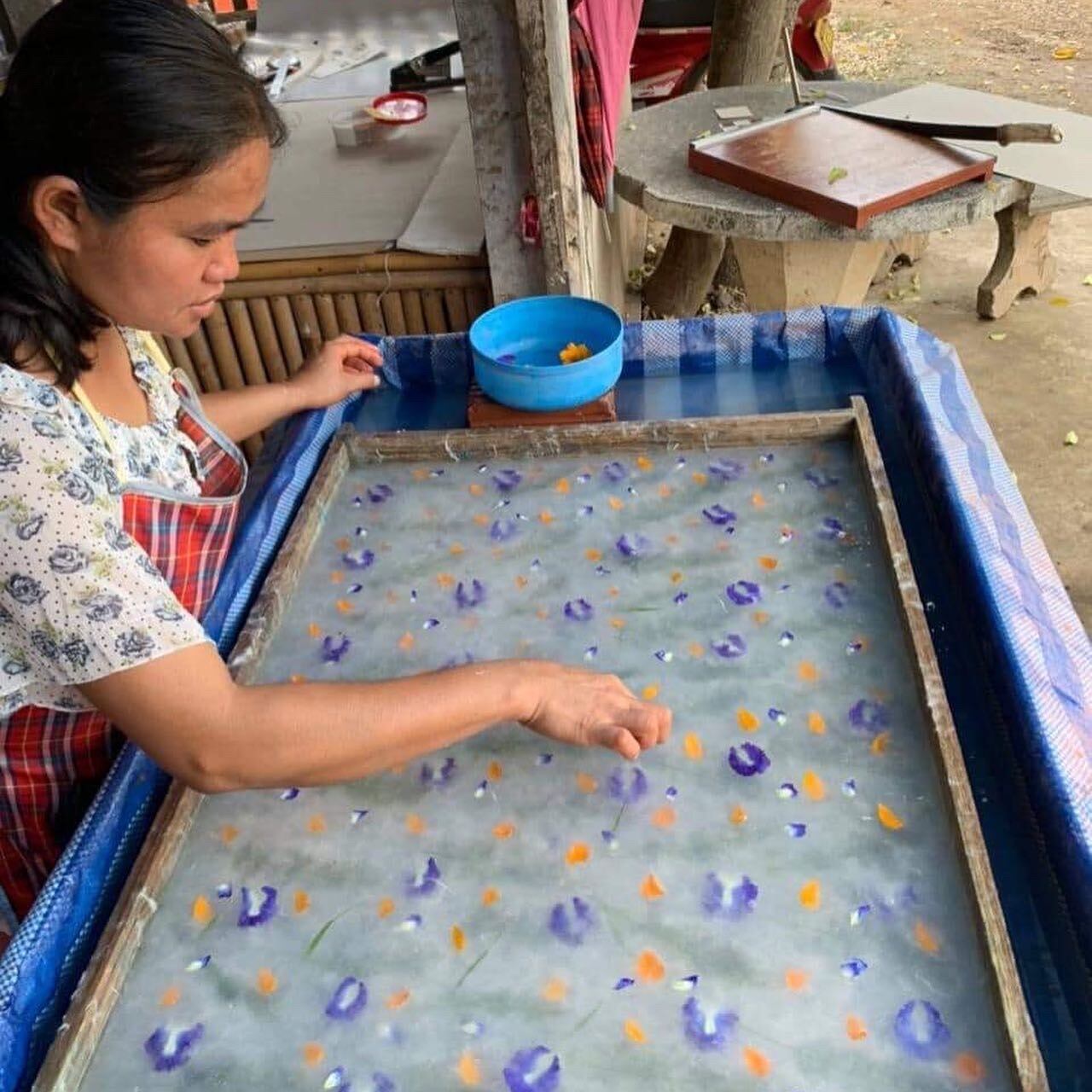 桑の木の皮を原料に、ラオスの国花ブルメリアの葉を使って色付けされています。