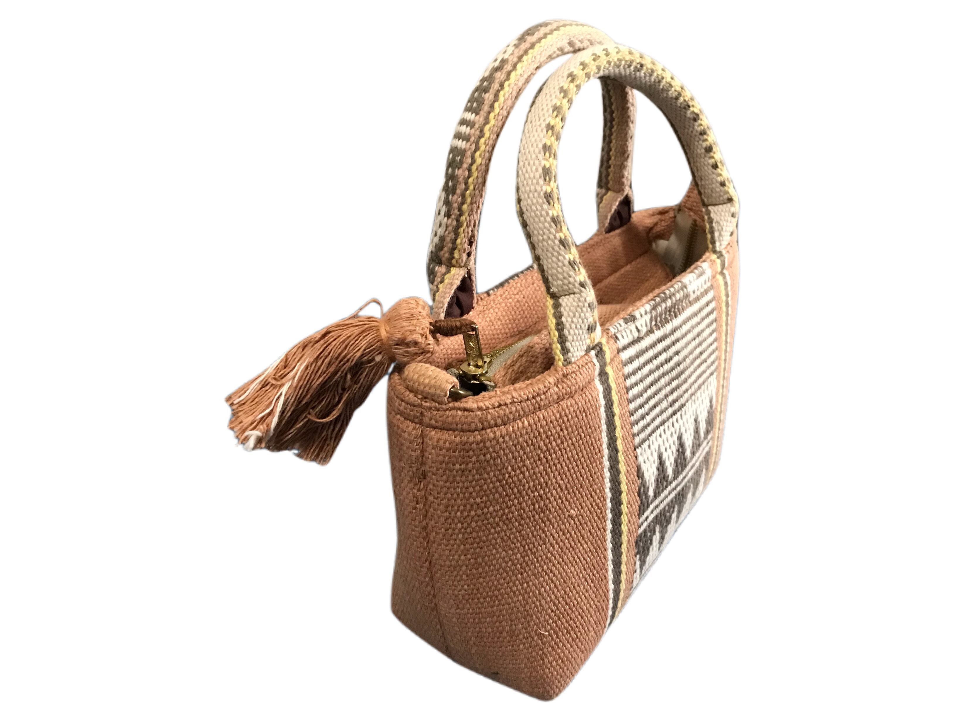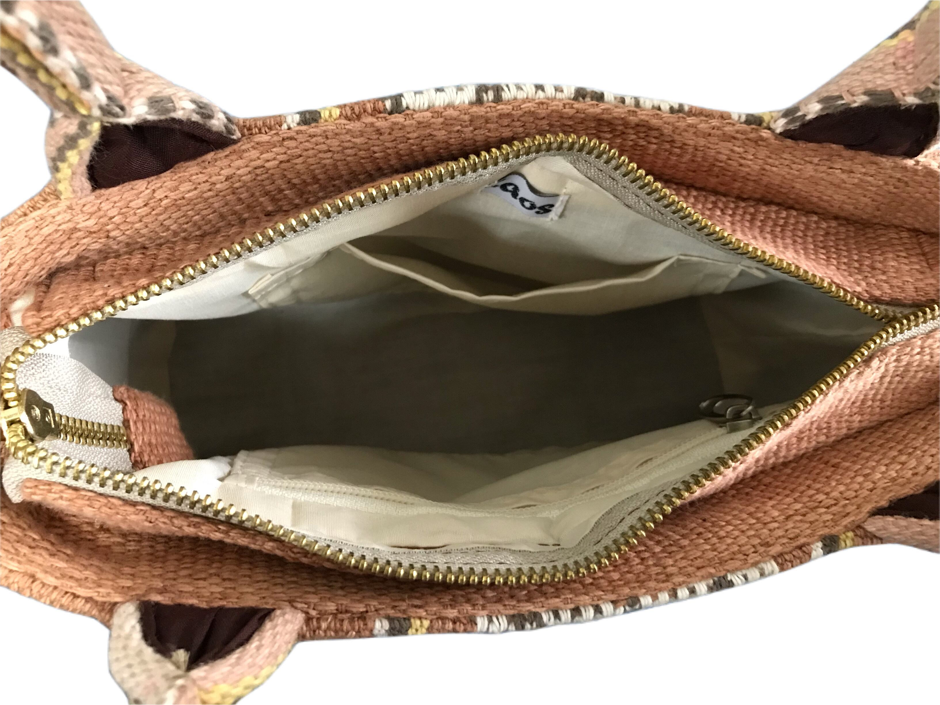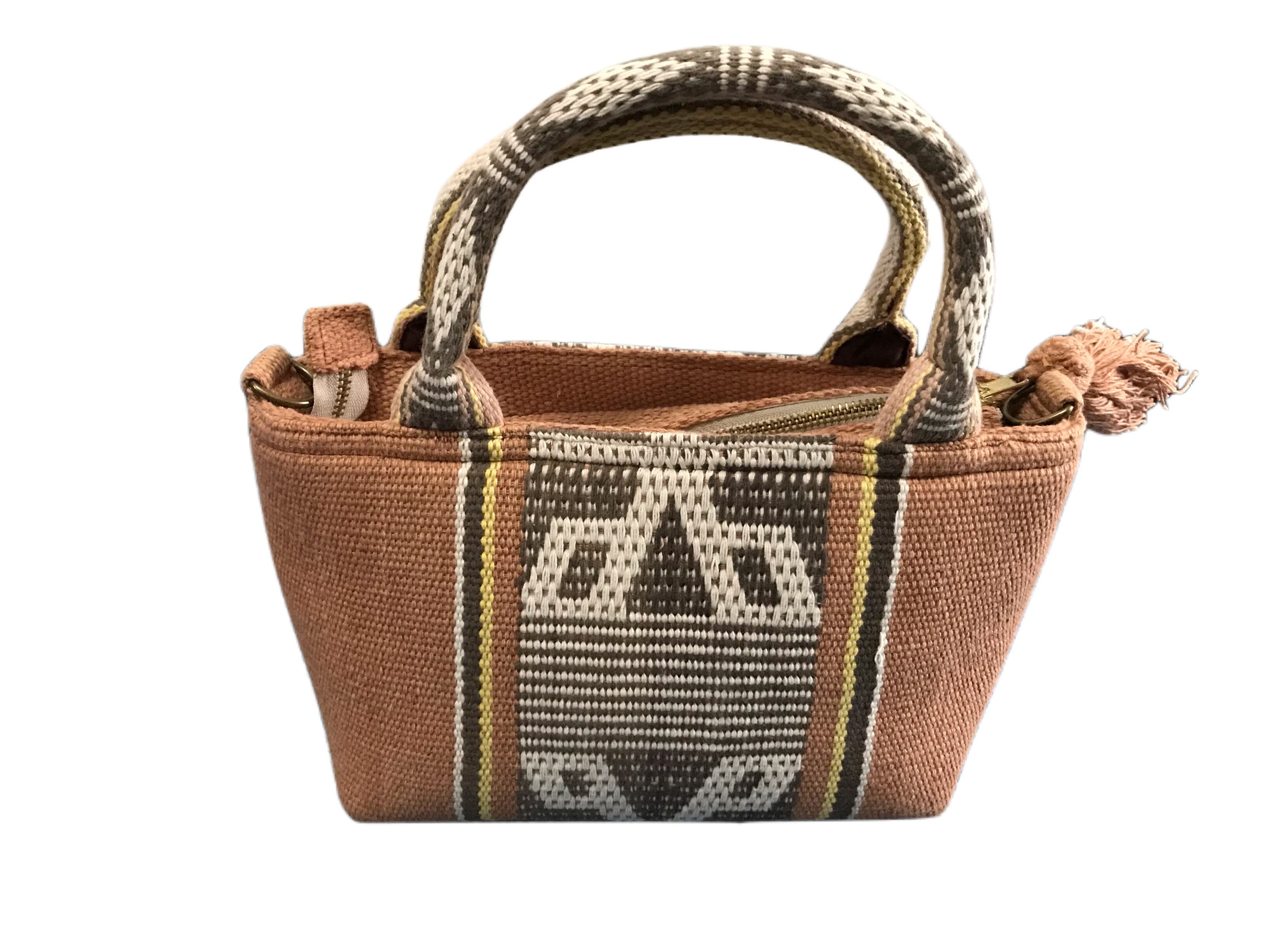 手織りで織った布を贅沢に使用し、鮮やかなサーモンピンクとタリアン族の伝統的な模様がデザインされています。